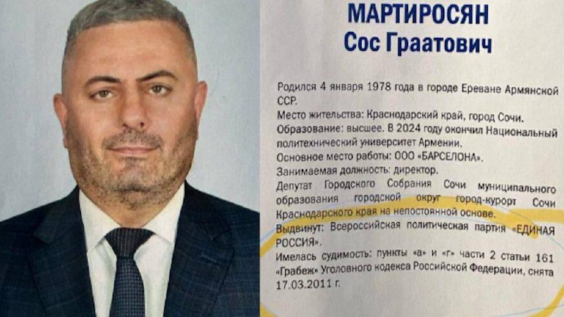 Судимый за грабёж глава армянской диаспоры Сочи, чья избирательная агитация стала мемом в соцсетях, избран депутатом города. Несмотря на упоминание о прошлой судимости, Сос Мартиросян набрал наибольшее число голосов в своём округе. В интервью он заявлял, что диаспора занимается «сохранением культурной идентичности и связями с Арменией», а также сотрудничает с администрацией Сочи по вопросам развития армянской общины. 📍 Подписывайтесь на Инфо24 | Прислать новость