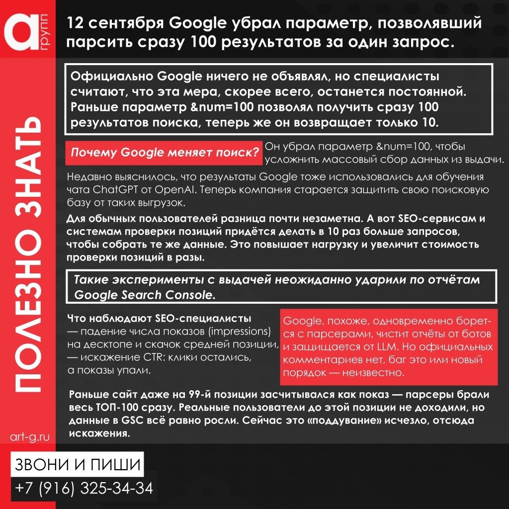 Google убрал параметр `&num=100`: вместо 100 результатов теперь выдаётся только 10, и парсить позиции стало гораздо неудобнее. Причина в том, что данные Google использовались для обучения ChatGPT, а сами массовые парсеры-боты нагружали поисковик и искажали статистику. Теперь компания старается защититься и от выгрузок для нейросетей, и от чрезмерной активности роботов. Наш сайт: ✔️https://art-g.ru Телефон: +7 (916) 325-34-34 💬 Оставляйте свой комментарий! #созданиесайтов #разработкасайтов #разработатьсайт #сайтназаказ