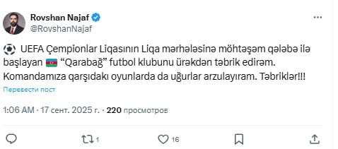"Искренне поздравляю футбольный клуб "Карабах", который начал этап Лиги чемпионов УЕФА с великолепной победы. Желаю нашей команде успехов и в предстоящих матчах. Поздравляю", - говорится в посте.
