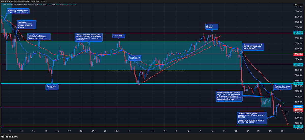 На российском рынке перед началом экспирации высадили всех. Сначала тех, кто ловил первый отскок от 2800 пунктов на фоне публикации СМИ о переносе санкций со стороны ЕС. ЕС отложил новый пакет санкций против РФ для согласования с G7. Страны готовят очередной пакет ограничений, текст планируют утвердить в ближайшие 2 недели. По данным Bloomberg, причиной стало требование США принять серьезные меры прежде, чем санкции ужесточит сам Вашингтон. В 11:30 фьючерс на индекс МосБиржи в моменте упал более чем на 5%, опускаясь ниже 270 000 пунктов. Видимо кому-то нужно было к экспирации значения ниже. Это в свою очередь перед обедом спровоцировало роботов и началось падение без каких-либо новостей по всему рынку. На этом фоне индекс МосБиржи упал ниже 2800 пунктов. После 16 часов, рынок резко развернулся на очередных словах Трампа: «Европа должна прекратить покупать нефть у России. Зеленский должен пойти на сделку., Похоже, придётся садиться за стол с Путиным и Зеленским. Сегодня лучше не торгова