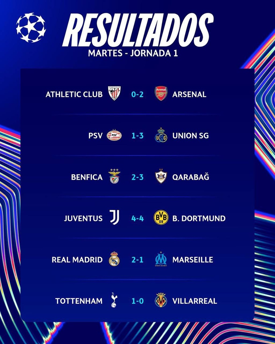 🇪🇺 Результаты первого игрового дня в Лиге Чемпионов 2025/26 🇮🇹Безумие в Турине - все 8 голов забиты во втором тайме. Причем, Юве отыгрался с 2-4 уже в добавленное время. 🇵🇹В Португалии произошла сенсация от «Карабаха». Это их первая победа в ЛЧ и сразу в гостях над Бенфикой. 🇪🇸Так же стоит отметить тяжелую победу Реала. Решающий гол мадридцы забили уже в меньшинстве. У Мбаппе дубль, благодаря которому он дошел до отметки 50 голов за Реал.