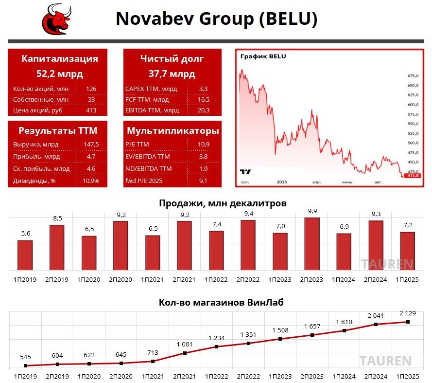 Относительно недавно делал обзор операционных результатов за 2кв2025 и много важных моментов там отметил, кому нужно освежить память - можете перечитать здесь (https://t.me/taurenin/3200). Если очень кратко: сейчас Новабев не является компанией роста, а рынок стагнирует. Основа роста прошлых лет - это сеть розничных магазинов ВинЛаб, которая тоже уже превратилась в зрелый бизнес. 📊 В 1п2025 компания смогла нарастить выручку на 21,1% г/г и увеличить операционную прибыль на 28% г/г. С корректировкой на курсовые разницы прибыль упала до 1,5 млрд р. 👆 Чистый долг с учетом обязательств по аренде вырос до 37,7 млрд р, а расходы на его обслуживание с начала года составили 3,5 млрд р (60% от операционной прибыли). ✅ Очевидно, что компания будет одним из главных бенефициаров снижения ставки и сокращение % расходов в 2 раза здесь может привести к резкому росту прибыли (p/e TTM был бы около 7). 👆 Как раз IPO ВинЛаба в формате cash-out может помочь с сокращением долговой нагрузки. ✅ За 1п2025 б