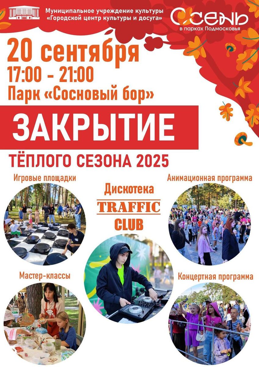 ЗАКРЫТИЕ ТЕПЛОГО СЕЗОНА 🍁 Завершаем лето в парке отдыха «Сосновый бор»! 🍁 📅 20 сентября, с 17:00 до 21:00, в парке отдыха «Сосновый бор» пройдёт тематическая программа «Закрытие тёплого сезона»! Что вас ждёт: 🎯 Игровые площадки с напольными играми 🎭 Анимационная программа с играми и танцами 🍨Мастер-классы по изготовлению мороженого из воздушного пластилина и магнитов из гипсовых фигурок 🏓 Настольный теннис 🎵 Концерт коллективов и солистов Городского центра культуры и досуга. 🎶Музыка, веселье и мастер-классы — всё для того, чтобы вы отлично провели время! Приходите и создайте незабываемые воспоминания вместе с нами! Давайте завершим этот тёплый сезон ярко! 🍁✨ #ГородскойОкругКоломна #НашеПодмосковье #Московскаяобласть