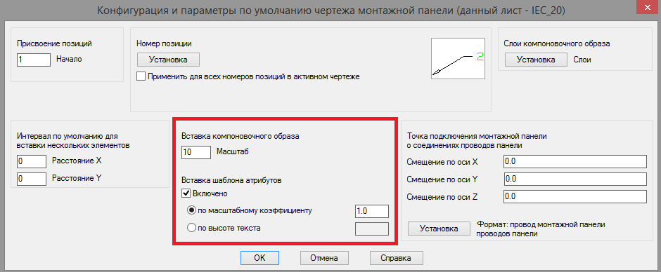 Если опция Включено под заголовком Вставка шаблона атрибутов активна, (то есть в компоновочные образы будут добавляться шаблоны атрибутов), и масштаб вставки компоновочных образов не равен 1, то необходимо задать высоту добавляемых атрибутов одним из двух способов: