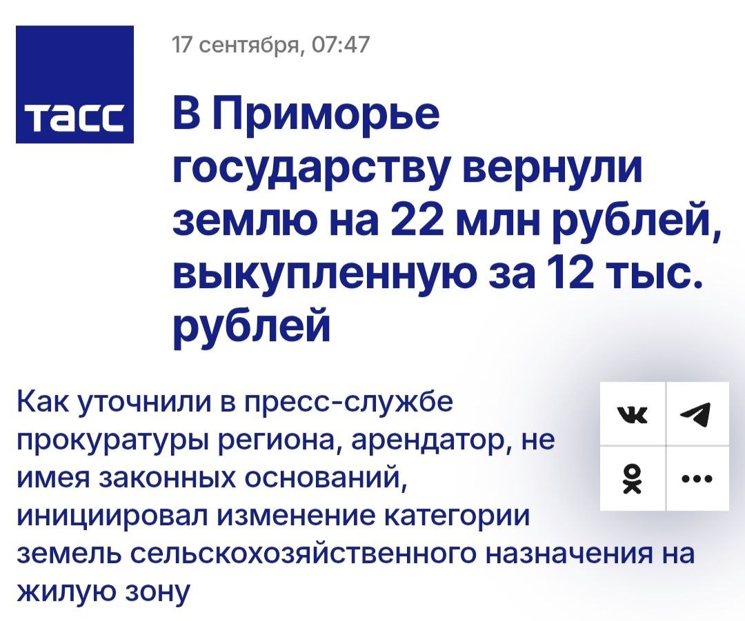 👤 Прокуратура через суд изъяла у «недобросовестного арендатора» земельный участок сельхозназначения в 2,4 га, который незаконно переведи в жилую зону, и выкупили всего за 12 тыс рублей при реальной стоимости в 22 млн. 🔗Формулировки ТАСС прекрасны: «арендатор, не имея законных оснований, инициировал изменение категории земель .. после этого он обратился к администрации города с заявлением о передаче участка в собственность без проведения торгов». То есть как бы такой вот плохой арендатор, все сделал сам, а никто и не заметил, что 2,4 га ушли на какое-нибудь комплексное освоение Тем не менее, речь о содействии местной администрации все же идёт, и по факту мошенничества возбуждено уголовное дело — а схема так-то была рабочей, частично компенсировала бы девелоперу нынешний негатив по ставкам. Даже жалко его немного что ли, и будущих покупателей жилья: успел бы построить — почти все было бы довольны. Уйти что ль из админов в арендаторы, если так просто можно «инициировать».. 🧊 Моноли