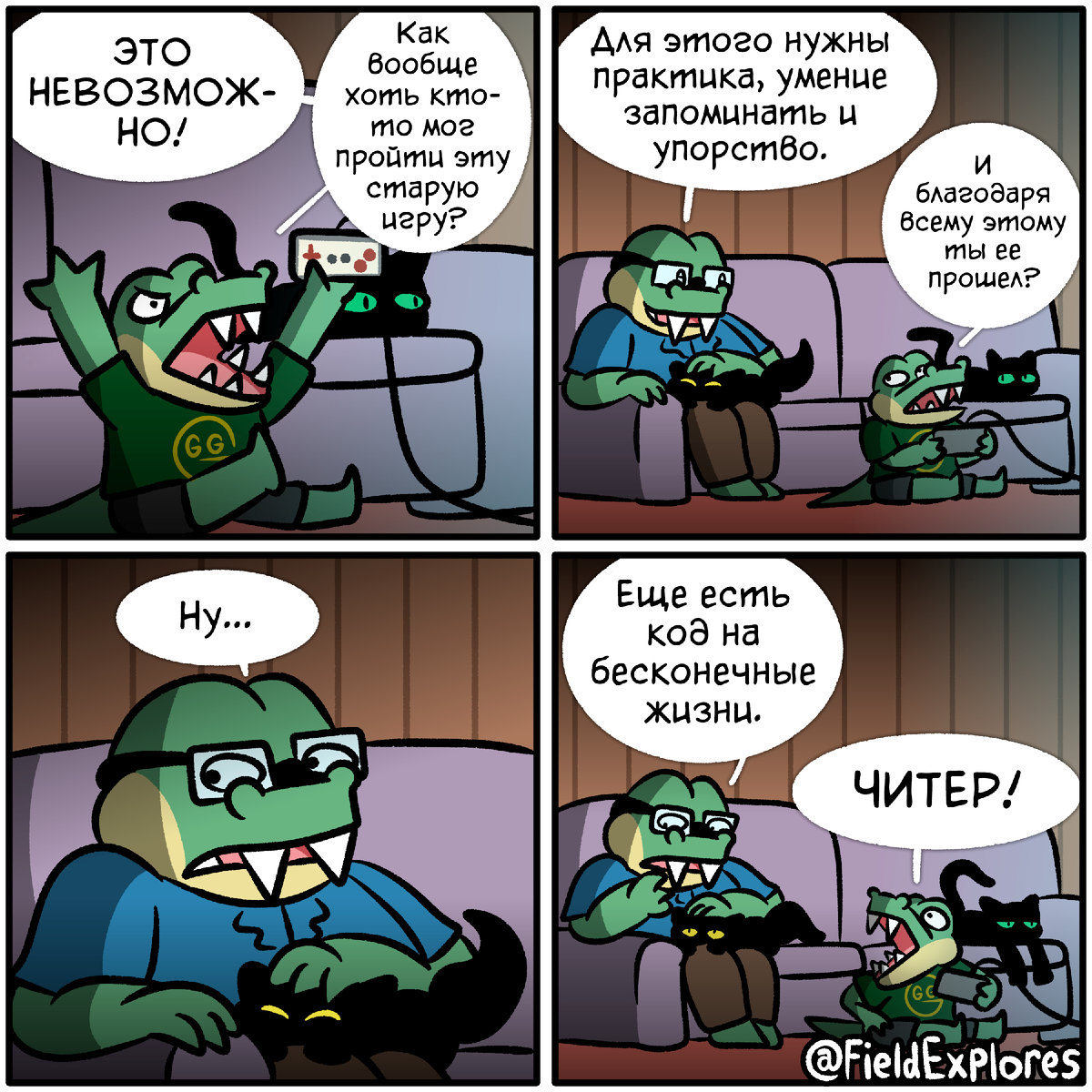 Юмор может быть самым разным - кому-то нравятся просты жизненные шутки, а кто-то любит что-то пожестче и почернее. Серия, о которой пойдет речь сегодня, к примеру - это очень теплая и милая история, которая понравится всем, кто любит житейские зарисовки и проработанных персонажей. А еще эти комиксы могут зайти всем, кто любит видеоигры! Если вы как раз из таки - уверен, что ниже вас ждет приятное и интересное чтиво. Gator Days (англ. «Дни аллигатора») - это серия юмористических веб-комиксов о семейке антропоморфных крокодилов, созданная анонимным художником, который известен в сети под ником Field (также страницы автора можно найти под такими названиями, как FieldExplores и Grandma Field). Проект стартовал в начале 2024 года, с тех пор новые выпуски каждую неделю появляются в соцсетях, а также на таких сайтах, как Tumblr и Reddit. Изначально Field рисовал комиксы исключительно с персонажами известных видеоигр - в основном это были герои серий Pokémon и Super Mario Bros. В таком формате