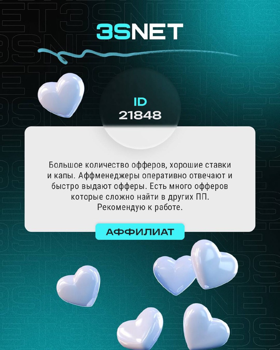❤️🔥 Когда о нас говорят партнёры — это всегда приятно. Так мы понимаем, что именно ценно для вас: скорость выдачи офферов, условия, поддержка. Такие отзывы помогают нам держать планку и расти вместе с вами. 👉Поделитесь своим опытом сотрудничества с нами. 😎 Ваш отзыв важен и для нас, и для тех, кто только присматривается к 3SNET.