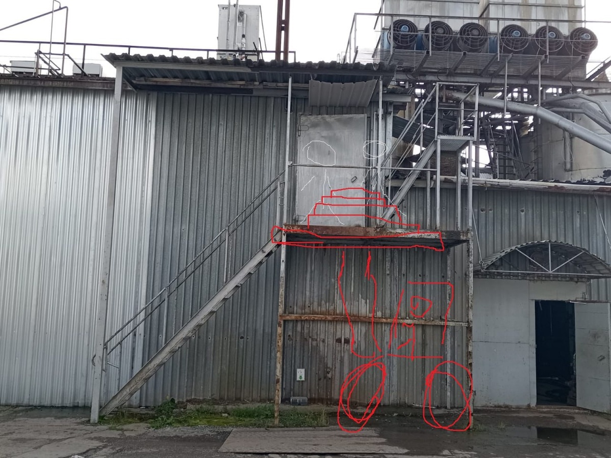 Есть аварийная наружная лестница (не пожарная и не эвакуационная), которая ведёт в помещение водоочистки и на крышу.