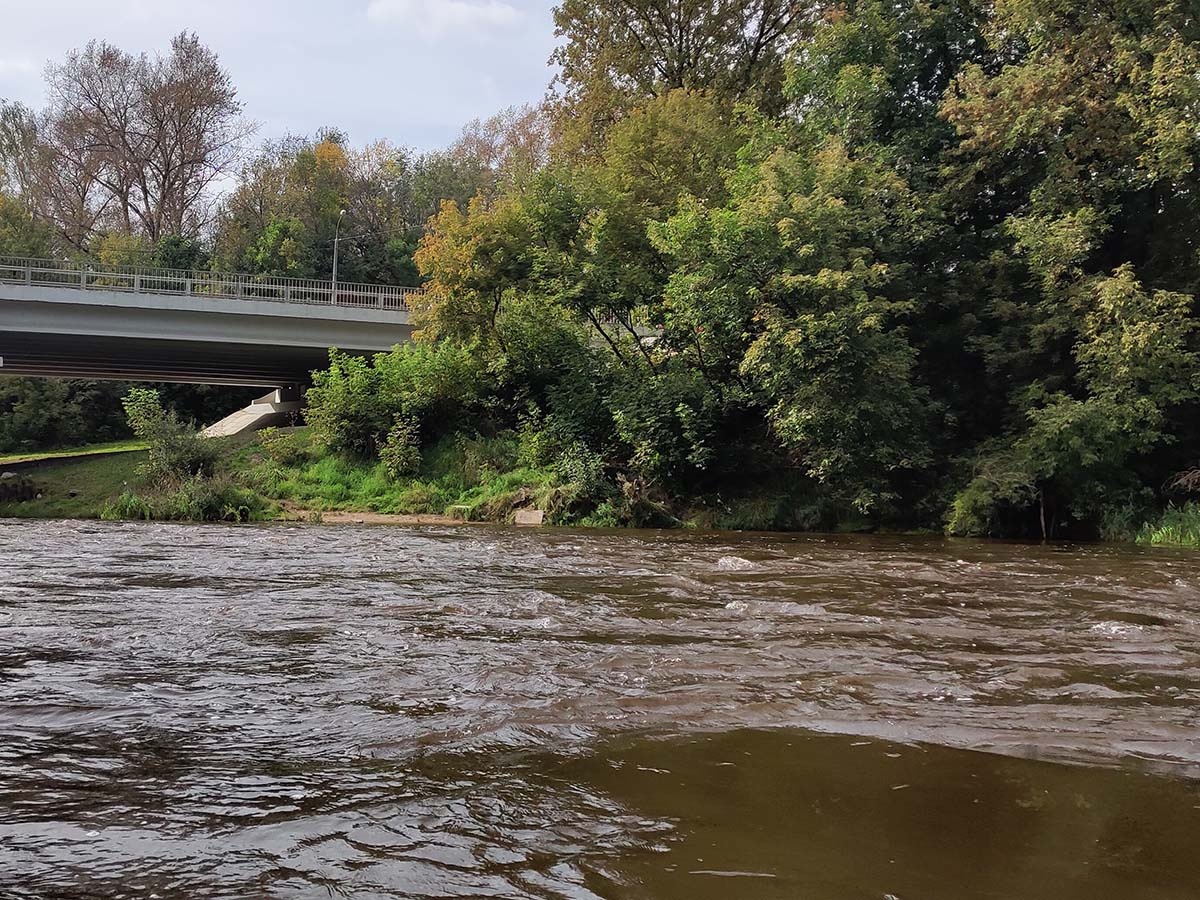 Из-под моста на М10 несутся волны, создаваемые Новотверецкой ГЭС, но скоро вода успокаивается, хотя течение, к счастью, довольно хорошее,