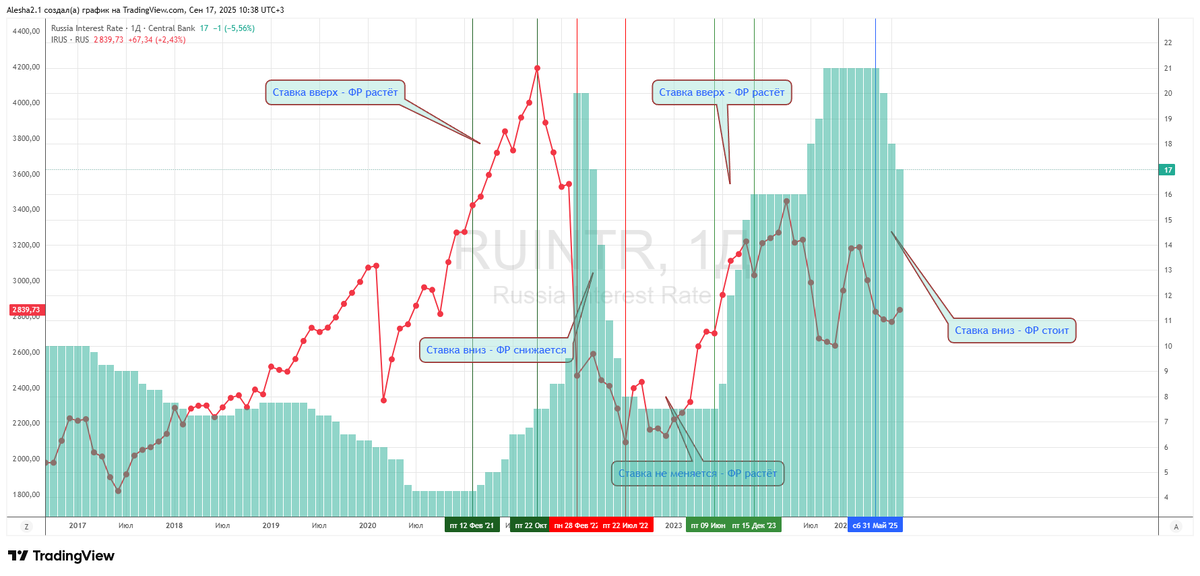 "Таким образом, низкая ключевая ставка положительно влияет на рынок акций" - РБК. Если бы это работало, то инвесторы и спекулянты ФР спокойно бы зарабатывали на нём деньги, но реальность несколько иная. А что же показывают нам исторические данные: Кто-то скажет что отечественный ФР ненастоящий, настоящий только в США, посмотрим и его: Как видно что на отечественном, что на американском ФР нет никакой зависимости от ставки ЦБ(ФРС). ФР живёт своей жизнью, только мельком оглядываясь на ДКП центральных банков мира.