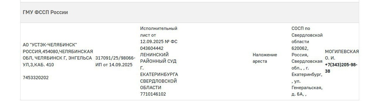 ❗️Суд наложил арест на счета «УСТЭК-Челябинск», такая информация появилась в федеральной базе данных исполнительных производств