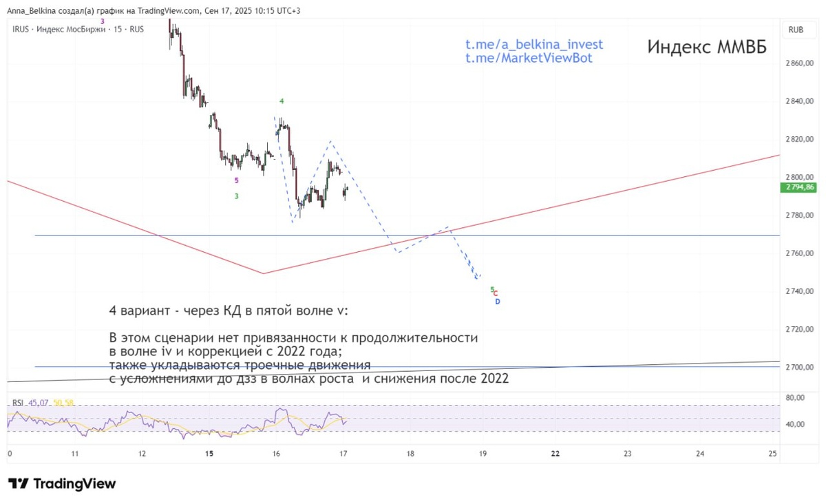#Micex #IRUS Индекс ММВБ идет на растяжение волны 5 of C of D. Пока движение развивается импульсно, но помним, что пятые волны могут встать через КД. В целом,полагаю, что в текущей фазе падения это завершающееся снижение. Далее ожидаю увидеть локальный откат. Возможно, новости об очередной попытке Трампа уладить конфликт на Украине в ближайшие сроки. Фьючерс на индекс ММВБ - завтра пройдет исполнение (экспирация) квартального фьючерса. Вчера была свеча с длинной тенью вниз. Технически, этой свечой поставили волну (D) of [x]. Не является ИИР 💪 БОЛЬШЕ разметок в Закрытом канале: Бот Закрытого Канала (подписаться из-за границы, пишите личным сообщением