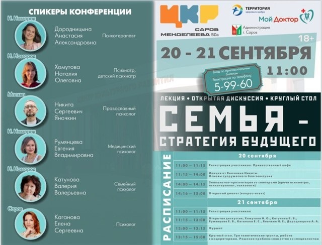 ↗ В эти выходные в Центре культурного развития пройдёт большая городская конференция "Семья - стратегия будущего". У саровчан будет уникальная возможность в формате открытого диалога обсудить со специалистами из Москвы, Нижнего Новгорода и Сарова важные вопросы, касаемые семьи и супружеского благополучия. Вход свободный, предварительная регистрация по телефону: 5-99-60.
