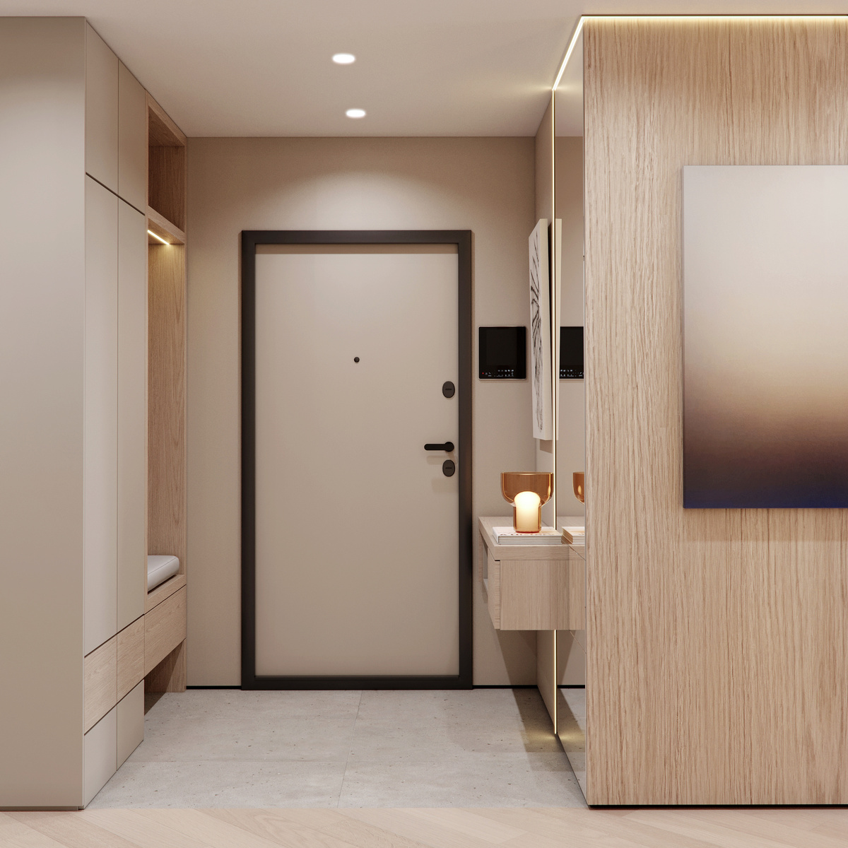 Перед вами визуализации холла квартиры площадью 45 м² в ЖК «Галактика». Мы сохранили существующую входную дверь, а рядом спроектировали функциональный шкаф: закрытая часть служит платяным шкафом, а открытая ниша с деревянной отделкой и крючками — для повседневной верхней одежды. Здесь же предусмотрено сиденье, где можно присесть и переобуться, а внизу — выдвижной ящик для мелочей и отдельная ниша для уличной обуви. В верхней секции удобно хранить головные уборы и сезонные аксессуары. Для отделки пола мы использовали сочетание керамогранита и паркетной доски (альтернативно рассматривается кварцвинил) — этот приём позволил разграничить функциональные зоны и при этом оптимизировать бюджет. В потолке встроены светильники, а по периметру стен мы применили современные теневые плинтусы, которые создают ощущение лёгкости и подчёркивают чистоту линий. Отдельным акцентом стала зона напротив входной двери: мы предложили асимметричное зеркало с подсветкой и лёгкой консолью, добавив современное и
