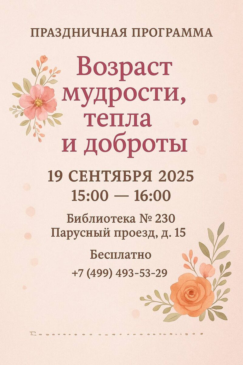 🌸 Праздничная программа «Возраст мудрости, тепла и доброты» 📅 19 сентября 2025 ⏰ 15:00 – 16:00 📍 Библиотека № 230, Парусный проезд, д. 15 (Южное Тушино, СЗАО) 🔞 12+ 💸 Вход свободный В программе: 📚 книжно-иллюстративная выставка «Нам года – не беда»; 📝 литературная викторина «Когда старость в радость»; 💻 презентация ресурса «Главное – душою не стареть»; 🎶 литературно-музыкальная программа «Поёт душа, танцует осень!» в исполнении дуэта «Мамина пластинка». ✨ Приглашаем окунуться в атмосферу тепла, музыки и воспоминаний! 📞 Справки: +7 (499) 493-53-29 🔗 Регистрация: по ссылке #Москва #библиотека #СЗАО #ЮжноеТушино #праздник #досугвсзао #ГБУКрылья