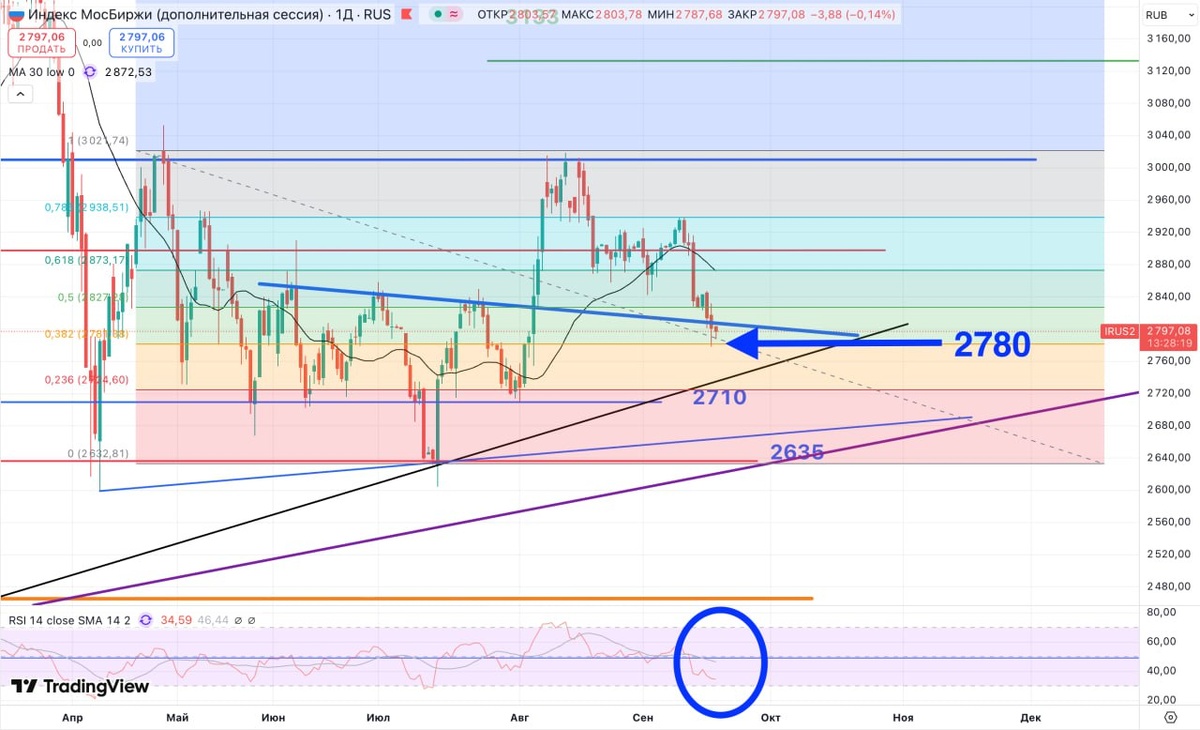 Продавили уровень сопротивления (синяя линия) и теперь явная цель - 2780 по индексу