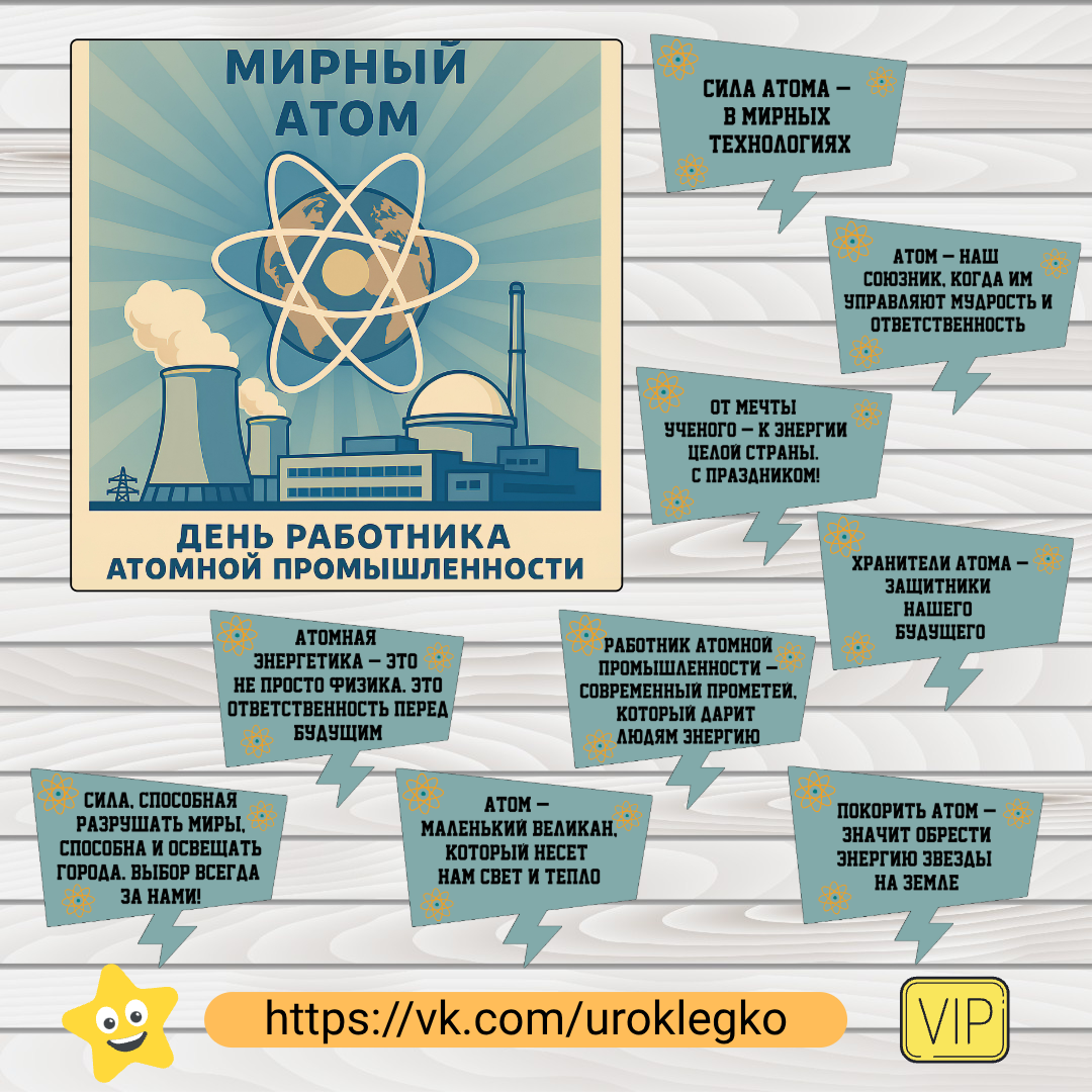 Данный набор для оформления понадобится для создания в школе торжественной и познавательной атмосферы в преддверии Дня работника атомной промышленности (отмечается 28 сентября). Он позволит ярко и информационно оформить холл, рекреацию или учебный кабинет, чтобы визуально привлечь внимание учащихся, а также рассказать школьникам о важнейшей роли мирного атома в современном мире — его использовании в энергетике, медицине, науке и промышленности, способствуя тем самым формированию у подрастающего поколения интереса к атомной отрасли и уважения к труду её специалистов. Где можно скачать: https://vk.com/uroklegko
