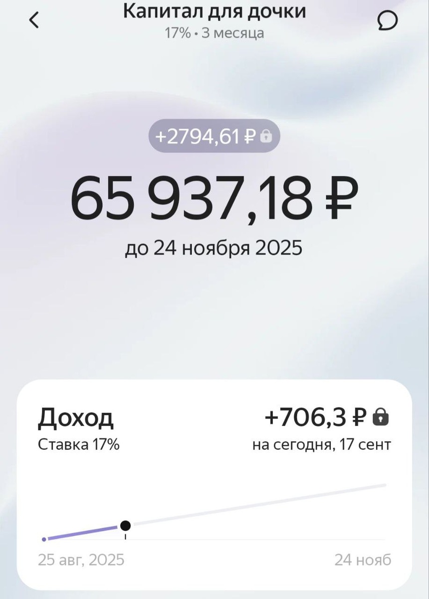 Пополнил счёт Капитал для дочки. В месяц откладываю по 2.310 руб. и перевожу на накопительный счёт в Тбанке. Основная часть лежит в Яндекс банке. После окончания срока, объединю суммы и открою новый вклад. Капитал для дочки: Тбанк: 2.310 руб.; Яндекс банк: 66.643 руб. Всего: 68.953 руб.