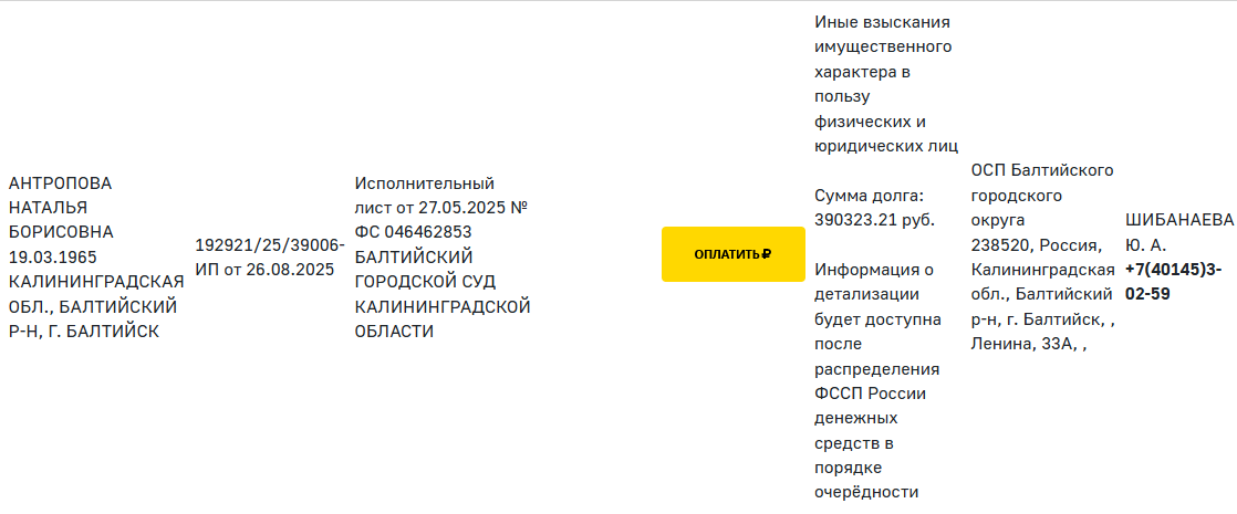 26 августа 2025 года судебный пристав-исполнитель ОСП Балтийского городского округа Шибанаева Ю.А. возбудила исполнительное производство №192921/25/39006-ИП в отношении должницы Антроповой Натальи Борисовны (на основании заочного решения Балтийского городского суда Калининградской области по взысканию с непорядочной гражданки долга по расписке в пользу моего клиента). Напоминаю, что заочное решение суд вынес 27 мая, взыскав с риэлтора Антроповой 364 788 руб. 05 коп. (в том числе проценты в порядке статьи 395 ГК РФ, судебные расходы по оплате услуг представителя и расходы по уплате госпошлины).