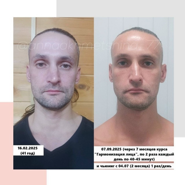 Как и многие парни, Евгений упорен, поэтому занимается ежедневно и комплексно, подтягивая и работу с телом. Евгений писал про сильную асимметрию, но, как мы видим, это как раз то, что очень заметно улучшилось!) Нос значительно сильнее уходил вправо, как и нижняя челюсть, выровнялся уровень глаз, ушей, верхняя губа, наполнился провал щеки справа (череп прямо развернулся), плечи тоже явно ровнее. Иначе выглядят глаза, углы поднялись, расширилась височная область (см в т ч. на разлет бровей), поднялось под глазами - появилась опора. В профиль разный свет может давать разные акценты, но есть стойкое ощущение, что именно изменилось положение скуловой кости и максилл - вся средняя треть под глазом выглядит значительно объемнее. В общем, молодчина, у парней стоит поучиться целеустремленности!) Благодарю Евгения, что поделился, и так держать!
