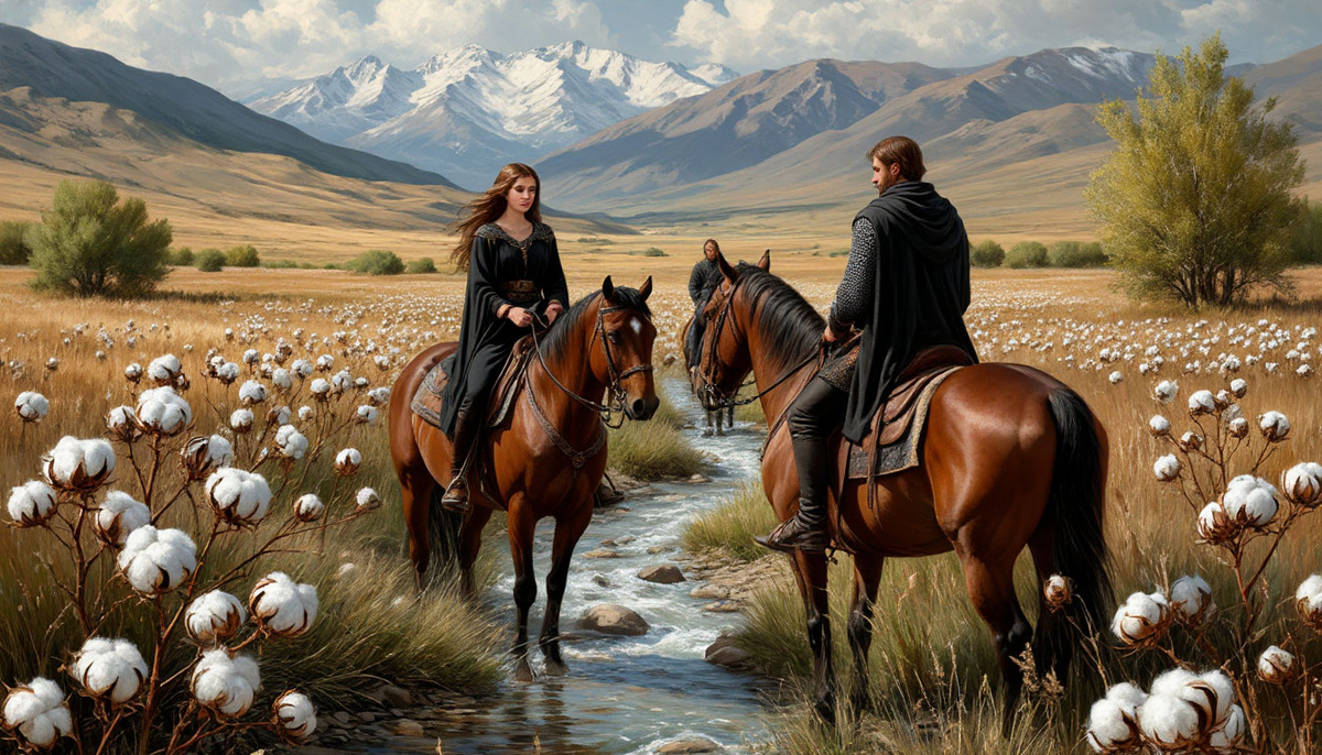 Много невиданного замечала Забава-Юлдуз. Однажды вот узрела она кустарник, негусто росший вразбежку тут и там вдоль малой речушки, звонкими струями стекавшей с недалёких гор. На первогляд обыкновенный не очень высокий кустарник, да только был он будто обсыпан обильно какими-то белыми комочками. Не оглядываясь на сопутствующего ей Маная, она спрыгнула с коня, подошла вплотную к кустам; со вниманьем присмотрелась; потрогала-потеребила пальцами эти комочки и, всплеснув руками, вымолвила одно лишь слово: «Чудо». Чудом же Забава назвала, проросшую из треснувших плодовых зеленоватых коробочек, знакомую ей с детства овечью шерсть-кудель, но здесь - на кустах она была белая, словно снег, и, на ощупь кончики пальцев чувствовали какую-то малую инакость.