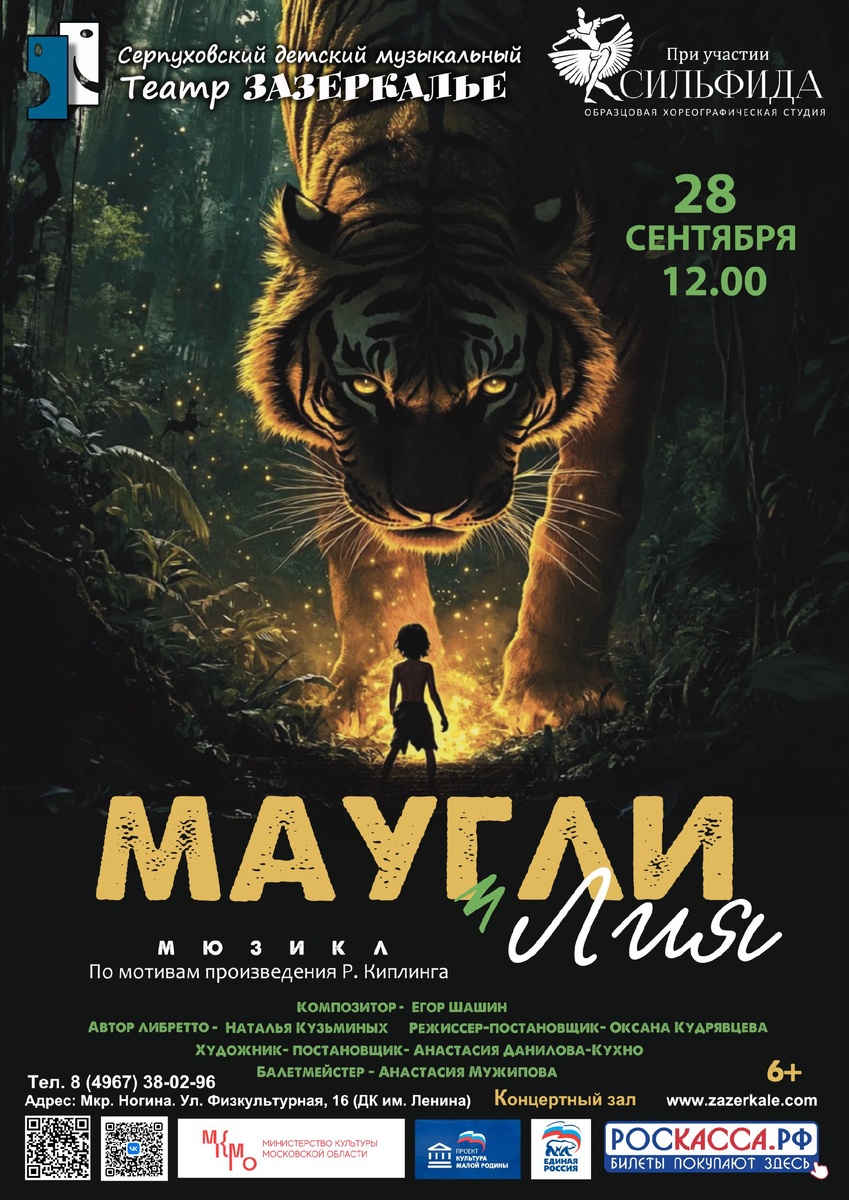 ✨ ПРЕМЬЕРА мюзикла "Маугли и Лия" ✨Мюзикл по мотивам произведения Р. Киплинга для всей семьи 📜Захватывающая история о судьбе мальчика Маугли, выросшего в диких Джунглях 🩰С участием образцовой хореографической студии "Сильфида 🚫 Возраст: 6+ 📆 28.09.2025 🕒 12:00 🏢 Серпуховский детский музыкальный театр "Зазеркалье" 📍 г. Серпухов, мкр-н Ногина, ул. Физкультурная, 16 в ДК им. В. И. Ленина 💰 Цена от: 500 до 800 ₽ 🎫 Купить билет: https://zazerkale.com/ ⭐Поддержать канал голосом 💰 Вакансия - курьер в Серпухове ✅ Мероприятия Серпухов https://dzen.ru/id/66f01c6eb4c6fe60c9ca1608 http://vk.com/serpukhov_events http://dzen.ru/serpukhov_events