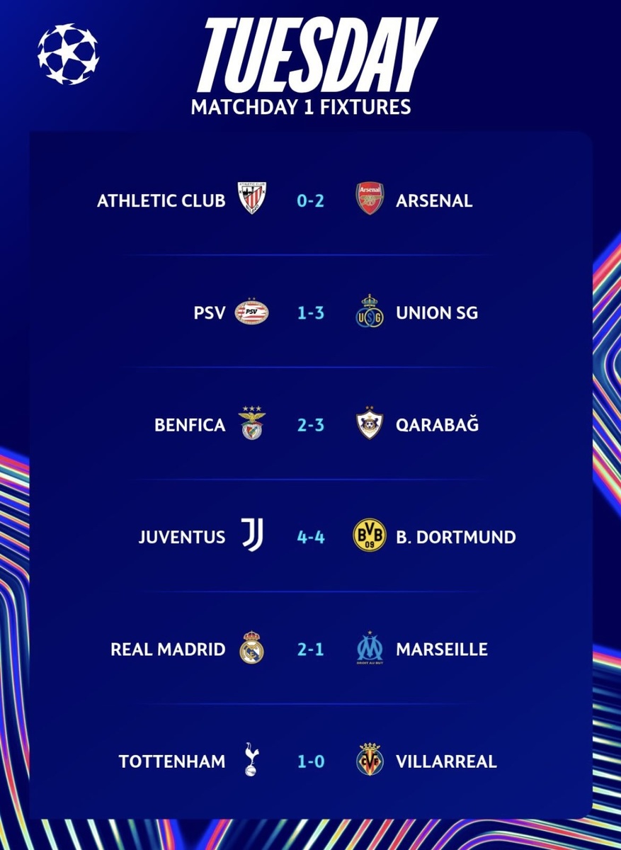 Замены Микеля Артеты принесли первые три очка "Арсеналу". Мартинелли и Троссард вышли во втором тайме ассистировали друг другу и добыли победу. Атака "Атлетика" многое потеряла ввиду травмы Нико Уильямса во время перерыва на игры сборных. Дебютант Лиги чемпионов побеждает в своем первом же матче. "Юнион" ошарашил "ПСВ" в первом тайме, но гол престижа хозяевам забить все же позволил. Главная сенсация первого дня! Волевая победа "Карабаха" над "Бенфикой" в Лиссабоне. Сразу после игры главный тренер португальской команды Бруну Лаже был отправлен в отставку. В центральном матче дня главным героем стал Душан Влахович. Он вышел со скамейки оформил дубль и отдал голевую передачу и спас одно очко для своей команды в компенсированное время ко второму тайму. Кенан Йылдыз забил очень красивый и ,вероятно, лучший гол игрового дня. Во втором тайме команды наколотили сразу 8 мячей. "Королевский клуб" побеждает во втором матче подряд, оставаясь вдесятером по ходу встречи. Пельто подарил "Реалу" втор