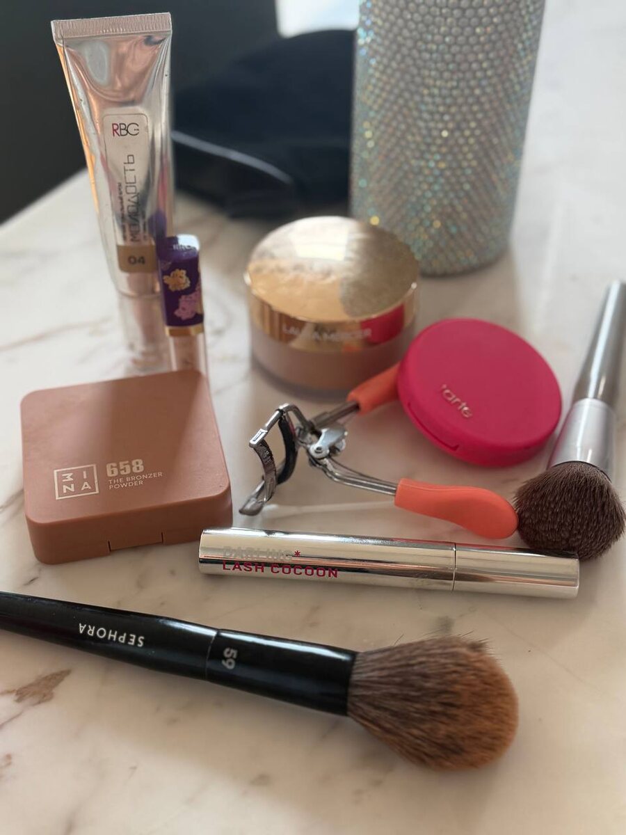 Быстрый обзор на то, чем крашусь сейчас : 1. Тональное красивое RBG 04 2. Tarte консилер 3.Zina ( Mina) бронзер, делаю скулы 4.Tarte румяна 5.Laura Mercier - Это пудра с блестками-можно мазать все!.И декольте , и тельце. Я сегодня скулы намазала. 6. Тушь. Darling, коричневая. На фото нет финиша - givenchy я люблю.
