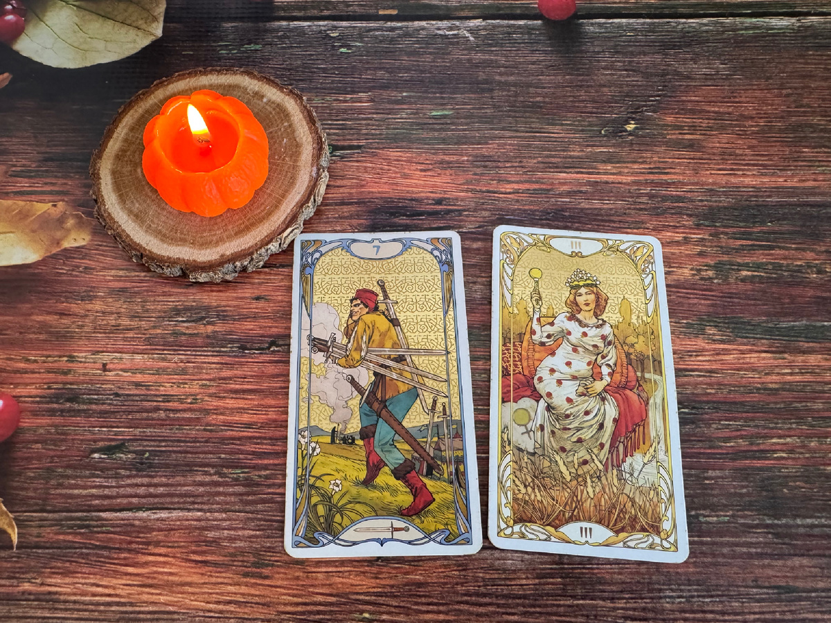 • В Вашей жизни сейчас царит атмосфера некоторой двусмысленности и, возможно, даже обмана. Семерка Мечей указывает на то, что кто-то пытается действовать нечестным путем, возможно, даже против Вас. Вам следует быть предельно внимательной и осторожной в своих делах и связях. Возможно, Вы чувствуете, что кто-то пытается ускользнуть от Вашего внимания или утаить что-то важное. Не позволяйте себя одурачить!