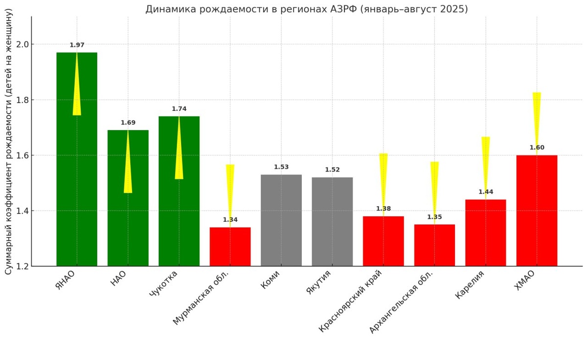 🚼 Суммарный коэффициент рождаемости в регионах Арктической зоны России в январе–августе 2025 года продемонстрировал разнонаправленную