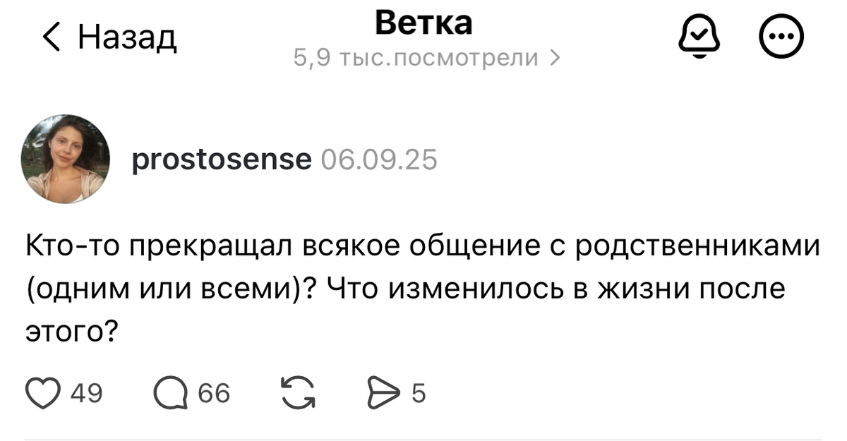 Я спросила в Threads отказывался ли кто-то от общения с родственниками. И что изменилось в их жизни после этого? Люди разделились на 2 лагеря: Делюсь в карусели несколькими ответами. И спрошу вас: был ли у вас опыт решения конфликтов с семьей прекращением общения?