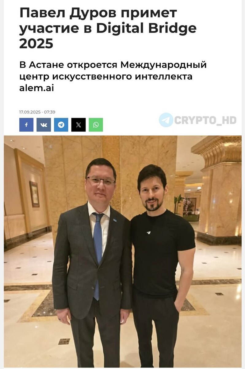 🇰🇿💎 #TON Павел Дуров выступит на Digital Bridge 2025 в Казахстане. 2 октября в Астане пройдет международный технологический форум Digital Bridge 2025, где основатель Telegram Павел Дуров станет одним из ключевых спикеров. Кроме того, в рамках мероприятия официально откроется Международный центр искусственного интеллекта при участии президента страны Касым-Жомарта Токаева. Ранее: - банки и крипта - крипторезерв Crypto Headlines
