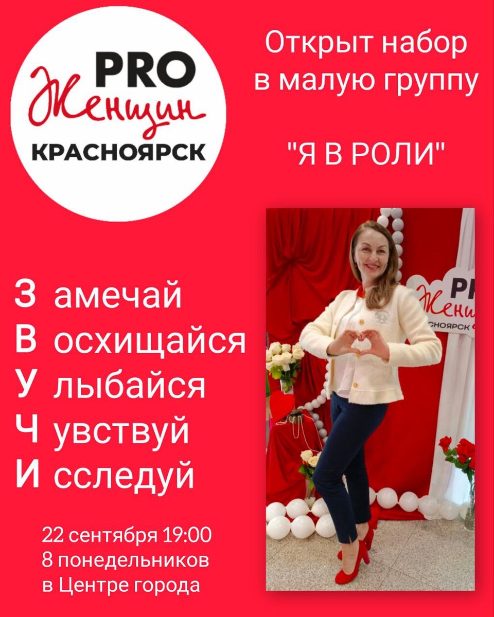 Приветствую каждую женщину, кто читает этот анонс🌹 Я, Валентина Андронович, лидер сообщества PRO Женщин Красноярска приглашаю стать участницей малой группы "Я В РОЛИ", которую запускаю 📆 22 сентября в 19:00 💥 8 понедельников в Центре города 🌞 Это время, где мы сами будем создавать атмосферу доверия друг к другу 🌞 Где можно быть собой 🌞 Где мы будем делиться своим состоянием и вместе совершенствовать его 🌞 Где необязательно, чтобы тебя понимали, при этом принимали всей душой 🌞 Где каждая будет ощущать поддержку и чувствовать, что её слышат На первой встрече мы протестируем все свои роли и после этого, каждая поставит свою цель для выбранной роли 💫 Зачем вам сюда? Чтобы застукать любую, даже самую малейшую недоудовлетворённость в своей жизни и превратить её в действия и благостное состояние от полученного результата 💫 Действовать будем из состояния лёгкости и доверия к миру, а не из напряжения и сверхусилий👌 💫 Получать будем поддержку друг друга, обратную связь, обмен