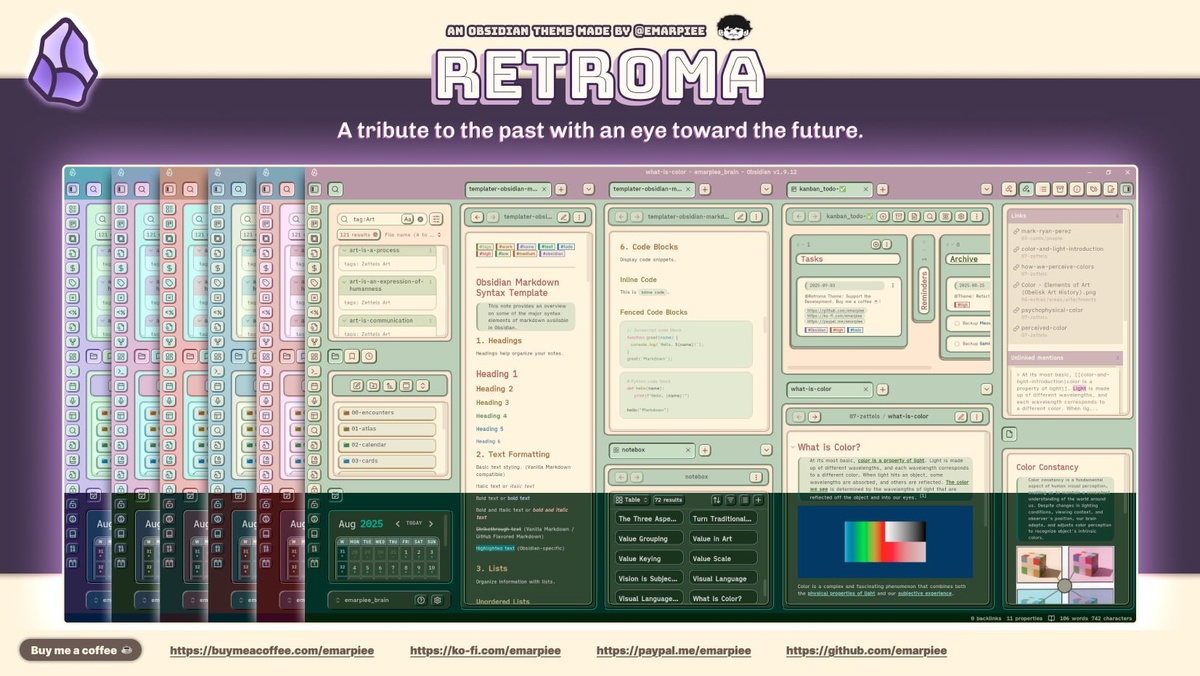 В ответ на пост 🗿 Retroma Theme Помните анонс? Тема добралась до релиза, и ее уже можно скачать из каталога тем внутри Obsidian. Никогда бы не подумал, что мне такое зайдет, но есть что-то в этой теме цепляющее. Повеяло духом Fallout, что-ли. И это первая тема на моей памяти, которой я могу пользоваться в светлом режиме, даже непривычно как-то после 5 лет работы строго в темных тонах. В общем, для себя решил дать шанс этому стилю оформления, посижу на ней недельку и потестирую. Но первые впечатления - сугубо положительные. P.S. Не забудьте установить Style Settings, с его помощью можно под себя настроить некоторые моменты интерфейса и цвета. Ну и поделитесь ощущениями и впечатлениями - как вам такой (не самый привычный) вид Obsidian? 📱 Github #ProObsidian #ДмитрийЛаухин #ОбсидианОформление ================================ 🎯 E-mail-рассылка Second Brain Press | 🧠 Демо-хранилище Second Brain Vault |🗿 Полный курс по изучению Obsidian | 📍 Zotero. Ваша личная библиотека