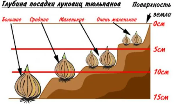 - Глубина посадки - 3 высоты луковицы от донца, от верхушки - 2 высоты. То есть если высота луковицы 5 см, то донце с зачатками корней должно находится на глубине 15 см, а верхушка - на глубине 10 см