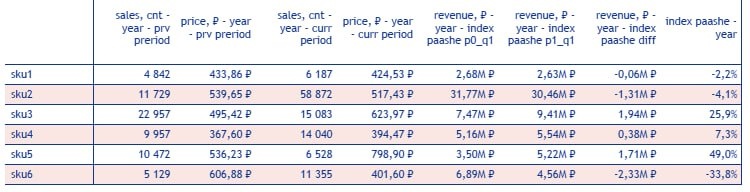 Ценовой Индекс Пааше и Ласпейреса Несколько месяцев назад от бизнеса прилетела задача сделать дашборд для анализа цен с помощью этих индексов. Не самые очевидные показатели, возможно вы слышите о них впервые. Тем не менее это интересные метрики, о них сегодняшняя публикация. Индекс Пааше – характеризует изменение цен за определённый период времени, отвечающий на вопрос: насколько товары в текущем периоде стали дороже (дешевле), чем в предыдущем, назван по имени предложившего его немецкого статистика, экономиста и политика Германа Пааше (1851–1925). Формула: Ip = ∑p1*q1 / ∑p0*q1 где p - price, q - продажи в упаковках Фишка этого индекса в том, что он позволяет взглянуть на объём текущих продаж в ценах предыдущего периода (года, квартала, месяца и т.д.). На примере "года", глядя на формулу видим, что q1 - это продажи текущего года в упаковках, p1 - цена текущего периода, p0 - цена уже предыдущего периода, получается частное объёма продаж в текущих ценах, к такому же объёму, но уже в