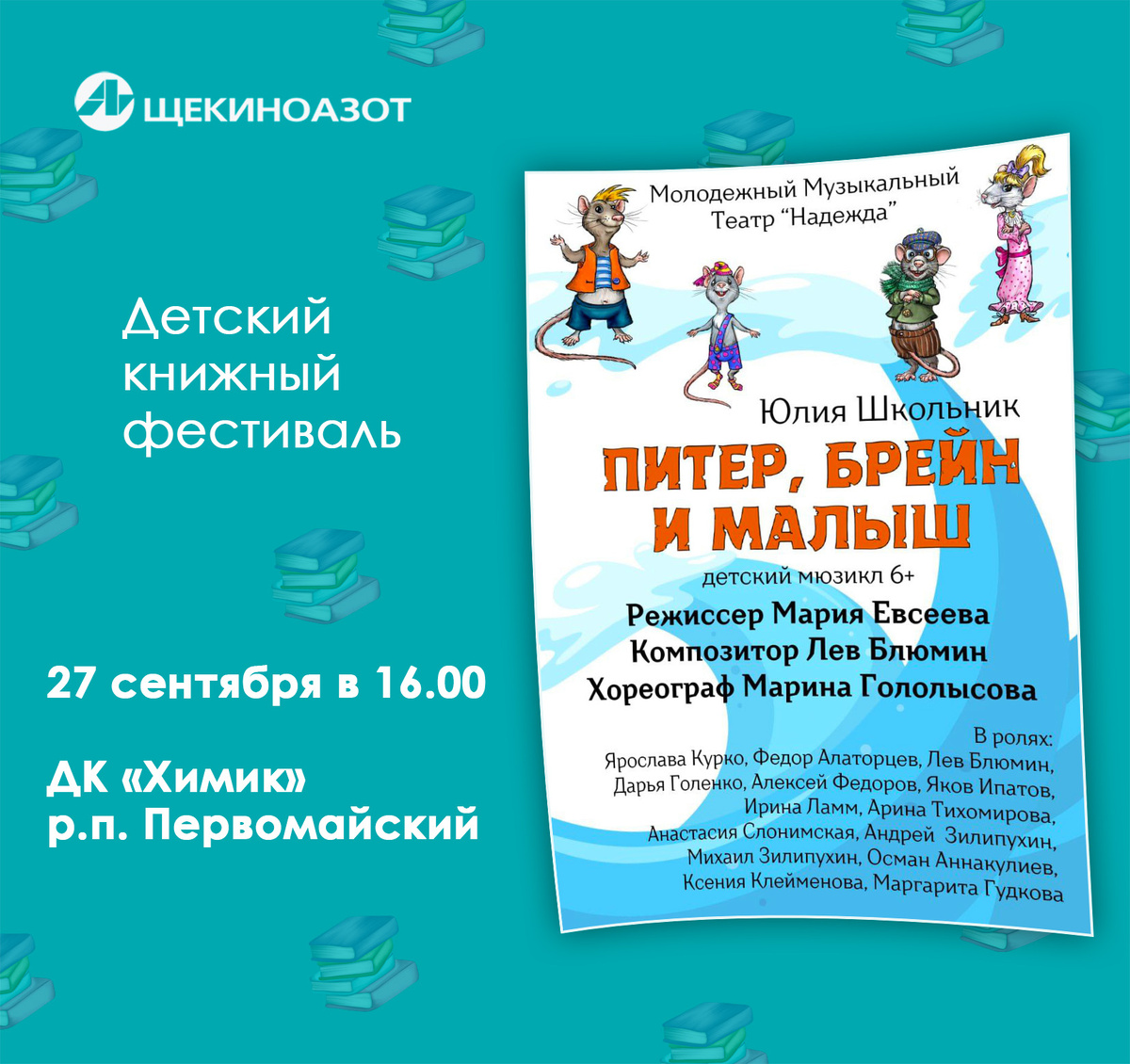 27 сентября в 16.00 на сцене ДК «Химик» рабочего поселка Первомайский в рамках детского книжного фестиваля Молодежный музыкальный театр «Надежда» из Москвы представит детский мюзикл-детектив "Питер, Брейн и Малыш". ✨ Попавшие на чужбину крысята Питер, Брейн и Малыш и их подружка Ирэн Ратлер расследуют детективные происшествия, чтобы получить помощь людей в возвращении домой. Они переживают наводнение, погоню с полицейскими, путешествие по канализационным трубам, пока не попадают в Тим-Хаус. Спектакль создан по мотивам книг Юлии Школьник, которая выступит на площадках детского книжного фестиваля в Щекинском районе в этом году. Яркие музыкальные номера, актеры и куклы, захватывающий сюжет и познавательные факты... Будет интересно всем! ❗6+ Продолжительность 1 час 10 минут без антракта. Режиссер: Мария Евсеева Хореограф: Марина Гололысова Композитор, аранжировщик, вокальные номера: Лев Блюмин Вход на мероприятие - по пригласительным. 📌 Телефон для бронирования билетов сотрудниками компан