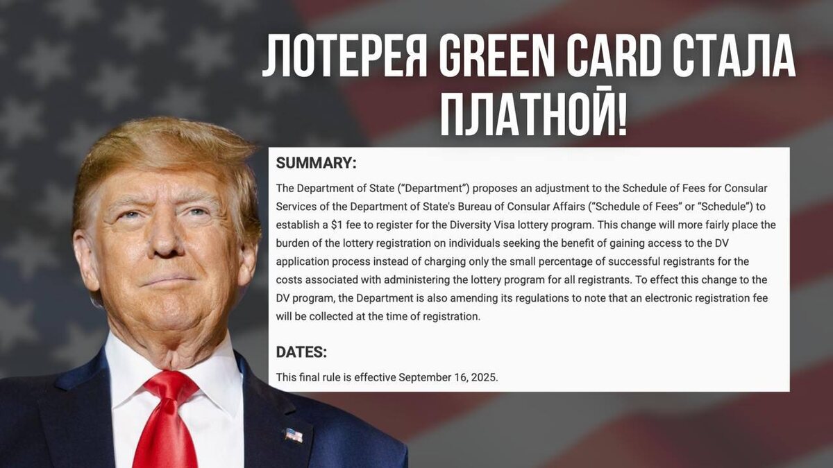 Лотерея Green Card стала платной! Впервые за всю историю розыгрыша Госдеп США вводит символический сбор $1 за участие. Зачем это нужно? Эта мера позволит снизить количество фиктивных заявок и даст право на участие заинтересованных и ответственных лиц. Что ещё изменится? В этом году планируется обязательное наличие действующего заграничного паспорта для подачи заявки. Возможно, потребуется прикрепить его копию. Электронный сбор в $1 будет взиматься в момент заполнения анкеты. Важно! Оплатить сбор картой российского банка не получится, потребуется карта иностранного банка. При этом карта может принадлежать не заявителю. 📄 Полный документ с разъяснениями доступен по ссылке: официальное разъяснение Теперь участие будет более избирательным, что повышает шансы на победу для тех, кто правильно подаст заявку. При подаче заявки с нами – мы оплатим ваше участие с проверенной карты иностранного банка. Регистрационный сбор уже включён в стоимость наших услуг, которые мы сохраняем на п