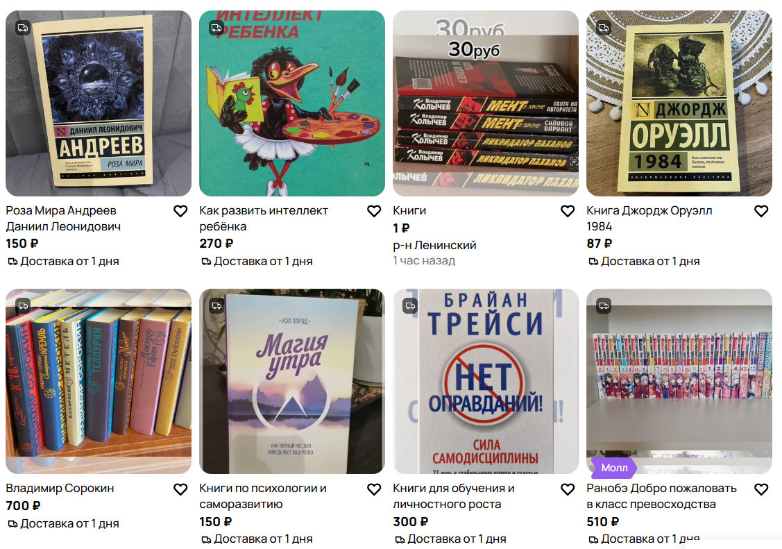 Особенно много на площадке детских книг, рыночные цены на которые кусаются, а на Авито детские издания из-за высокой конкуренции можно купить недорого, буквально за 50-200 рублей.