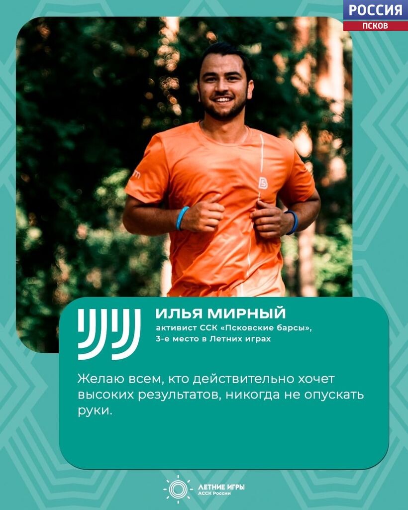 Магистрант ПсковГУ Илья Мирный стал бронзовым призёром Летних игр Ассоциации студенческих спортивных клубов России. Об этом спортсмен рассказал в эфире "Радио России-Псков". Участники соревновались в беге, плавании, сапсёрфинге, ходьбе и катанию на велосипеде. Результаты спортсмены фиксировали в мобильных приложениях. В общем зачёте Илья Мирный набрал 409 баллов и уступил лишь участникам из Ханты-Мансийска и Волгограда. Для спортсмена это уже третьи Летние игры – в 2023 году он также завоевал бронзу. "Каждый мог выбрать себе то, что по силам, то, что доступно, и в этих дисциплинах набирать баллы. Основной акцент у меня был на бег. Я бегал каждый день всё лето – по 5-10 километров. На работу я езжу на велосипеде – порядка 2-3 километров можно было прокатить и тоже получить баллы в зачёт. А ходьба по вечерам – это такая прогулка в темпе. Немножко поплавал, но не сильно много. Я понимал, что в топ-10 зайду, потому что знал, какая должна быть дисциплина. В целом я рад. Конечно, хотелось