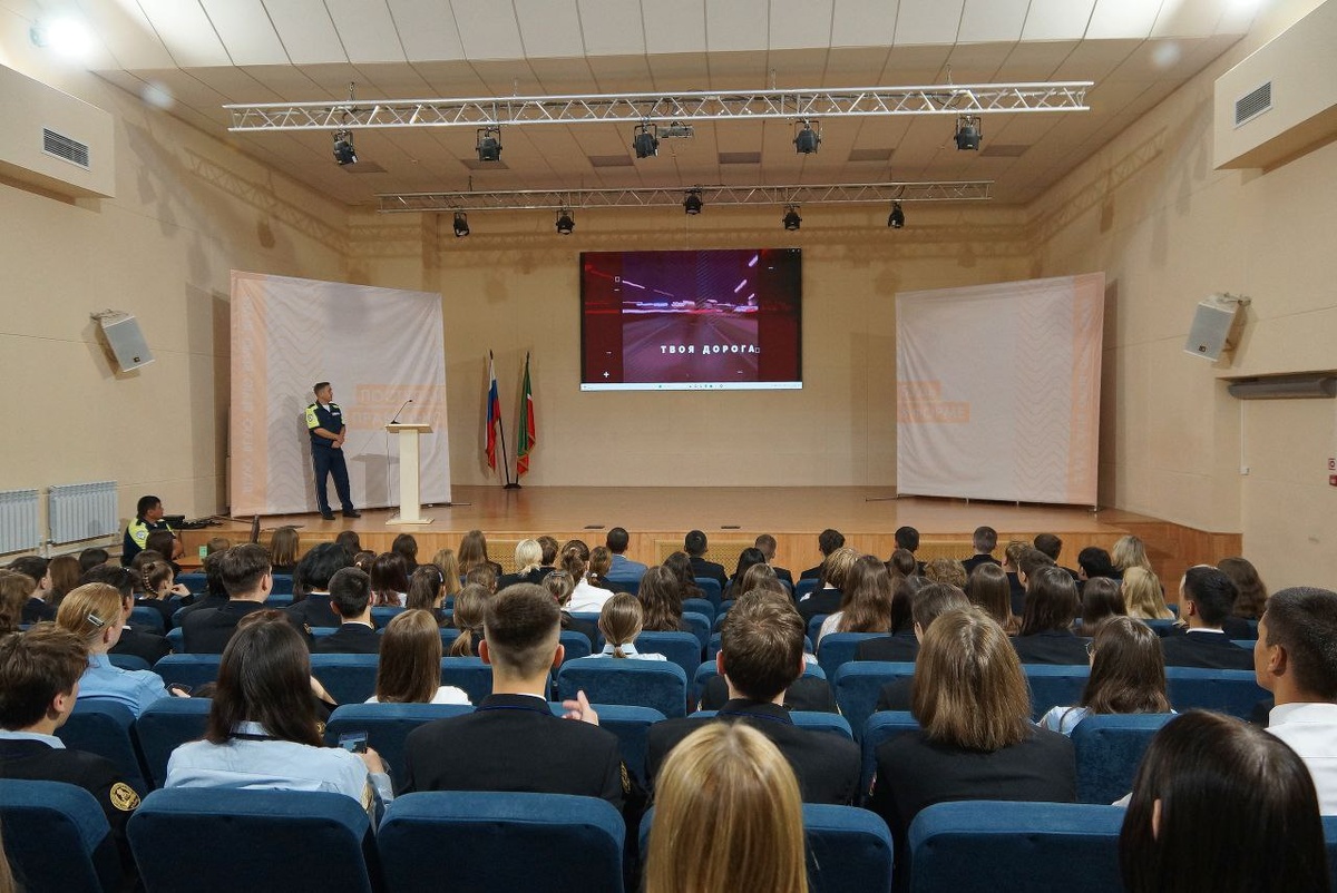 В рамках профориентационной беседы Роман Владимирович рассказал студентам о службе в ГИБДД, а также о социальных гарантиях и возможностях карьерного роста в системе МВД. Декан факультета высшего образования Гараев И. Г. поддержал тему беседы, отметив важность выбора профессии и готовности к служению обществу.