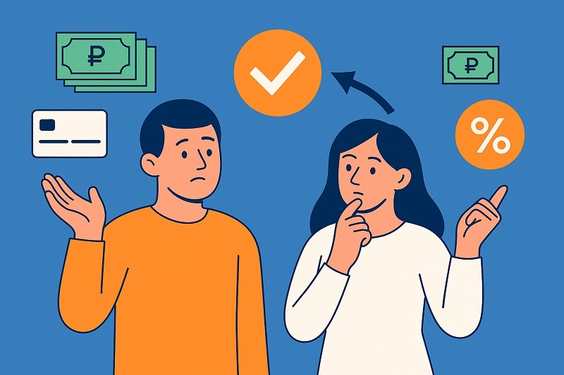 Например, сняли 30 000 ₽ и вернули через 20 дней — переплата составит всего пару сотен рублей. Но если растянуть возврат на 3–4 месяца, сумма процентов превысит комиссию во втором варианте.