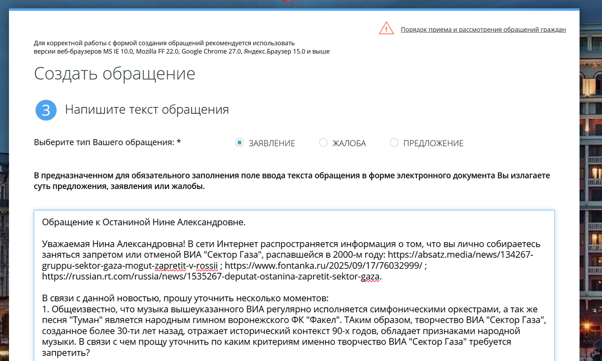 Одна умудрённая опытом деятельница обмолвилась о запрете группы "Сектор Газа". Уже правда переобулась... Но к моменту как я узнал про переобувку моё обращение в Госдуму уже ушло. Кстати вот оно: "Обращение к Останиной Нине Александровне. Уважаемая Нина Александровна! В сети Интернет распространяется информация о том, что вы лично собираетесь заняться запретом или отменой ВИА "Сектор Газа", распавшейся в 2000-м году: https://absatz.media/news/134267-gruppu-sektor-gaza-mogut-zapretit-v-rossii ; https://www.fontanka.ru/2025/09/17/76032999/ ; https://russian.rt.com/russia/news/1535267-deputat-ostanina-zapretit-sektor-gaza.