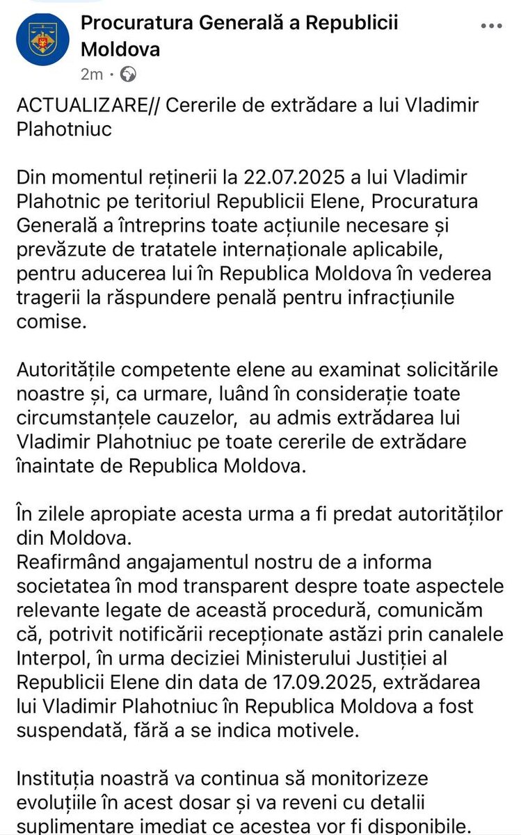 ⚡️🇲🇩Генпрокуратура: Экстрадиция Плахотнюка в Молдову откладывается