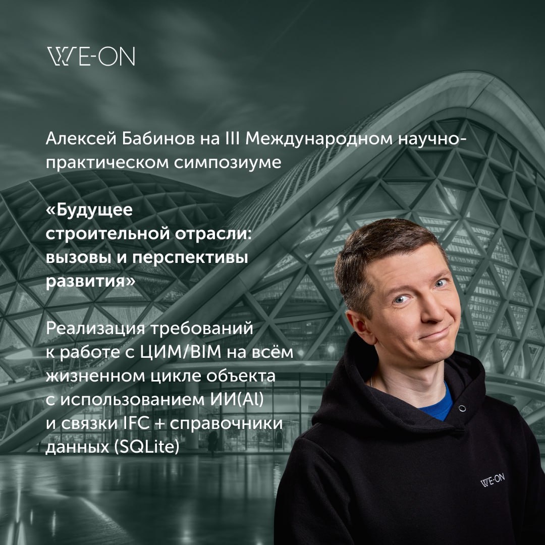 🗓 Завтра, 18 сентября, Алексей Бабинов, руководитель департамента исследований и разработок WE-ON, примет участие в III Международном научно-практическом симпозиуме «Будущее строительной отрасли» В рамках панельной дискуссии «Информационное моделирование и искусственный интеллект в строительстве» Алексей выступит с докладом на тему: «Реализация требований к работе ЦИМ/БИМ на всем жизненном цикле объекта с использованием ИИ (AI) и связки IFC + справочники данных (SQLite)» Речь пойдет о том, как современные цифровые инструменты помогают сделать управление жизненным циклом объекта более точным, прозрачным и эффективным 🔗 Ссылка на трансляцию Выступление Алексея завтра ориентировочно в 14:30 Подключайтесь! #weon #бим #ии #цифровизация