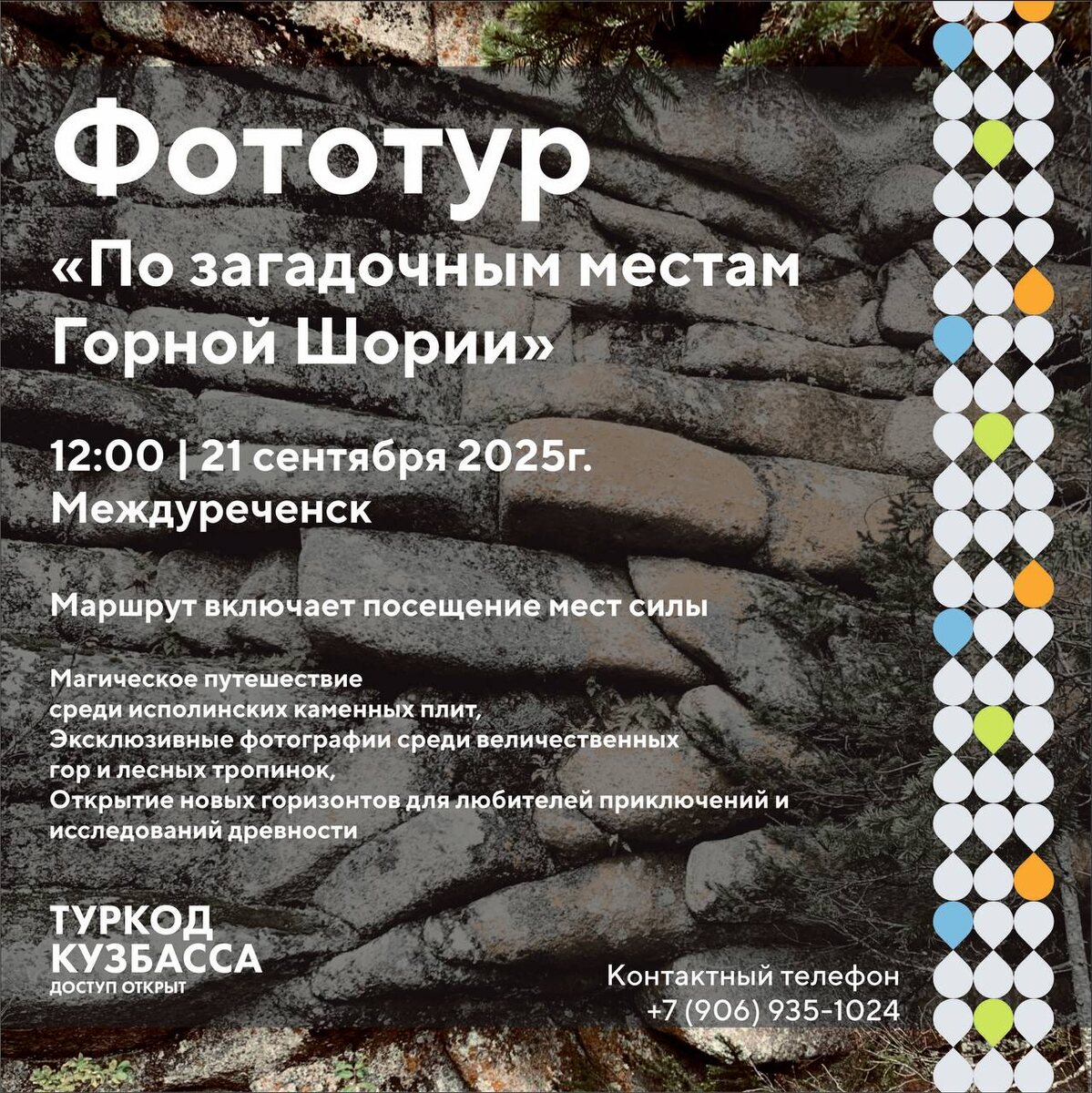 📸 Фототур на Мегалиты Горной Шории! 21 сентября приглашаем в удивительное путешествие — Фото-тур на мегалиты Горной Шории, Малый Изыгаш! Вместе с гидом-фотографом вы побываете в самых живописных и медийных местах, а также получите мастер-класс по съёмке. ✨ К участию приглашаются: — любители активного отдыха — фотографы-пейзажисты — искатели неизведанного — все, кому интересна природа Сибири и её древние тайны (18+) 📍 Время: с 12.00 до 19.00 📝 Регистрация и список необходимого снаряжения доступны по ссылке: forms.yandex.ru/cloud/68ca... Не упусти шанс поймать красоту Горной Шории в кадре! #ДЕЛАЮТУРИЗМВКУЗБАССЕ