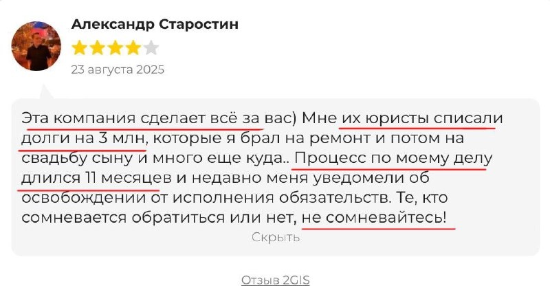 «Эта компания сделает всё за вас» или банкротство «под ключ». Буквально не выходя из дома вы можете избавиться от кредитов и долгов вместе с юристами компании «Авидос». ➡️Мы помогаем: — Убрать давление со стороны кредиторов; — Собрать весь пакет документов; — Провести полностью всю процедуру, контролируя каждый этап. Все отделы и юристы нашей компании ежедневно работают, чтобы вы могли комфортно пройти процедуру банкротства с результатом полного освобождения от долговых обязательств. ❗️Хотите пройти процедуру со 100% гарантией? Запишитесь на бесплатную консультацию, где мы разберём вашу ситуацию и предложим стратегию выхода из долгов. ЗВОНИТЕ ☎️8-800-200-66-89 📲 Написать в телеграмм