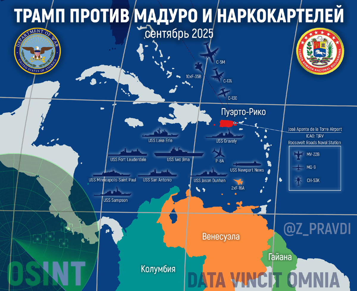 Разворачивающаяся истерия вокруг неуёмного желания Дональда Трампа побороть наркотрафик в Карибском море вот уже второй месяц не пропадает из новостных лент. Профильные СМИ и блогеры продолжают активно следить за развёртыванием группировки США в регионе. Главным «злодеем» в этой истории Белым домом изначально был назван венесуэльский президент Мадуро, а деятельность США рассматривается многими исключительно как подготовка к вторжению в эту страну под прикрытием борьбы с наркокартелями с последующей сменой неугодного Штатам режима. Всё это выглядит логичным, но есть нюансы, в которых мы сегодня попробуем разобраться. Начнём с того, что вся «заваруха» на Карибах началась с развёртывания в регионе внушительной корабельной группировки, состоящей из трёх эсминцев класса «Арли Бёрк» (USS Gravely, USS Sampson, USS Jason Dunhan) с управляемым ракетным вооружением, включающим ракеты Tomahawk, универсального десантного корабля класса «Wasp» (USS Iwo Jima), с палубы которого могут работать не тол