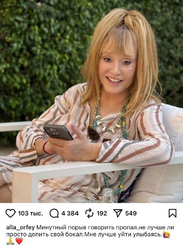 В ответ на пост Наговорившая лишнего Алла Пугачёва сделала вывод в запрещенной сети, что лучше молчать пить. ⭐️ Блокнот Старс