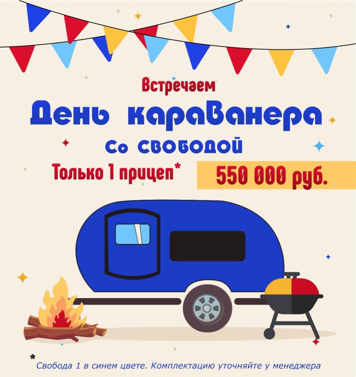 🎯 ЭКСКЛЮЗИВНОЕ ПРЕДЛОЖЕНИЕ К ДНЮ КАРАВАНЕРА! 🎯 24 сентября — особенный день для всех любителей путешествий! В честь этого праздника мы приготовили для вас суперпредложение! ❗Только один прицеп «Свобода 1» из наличия по невероятно выгодной цене — 550 000 рублей! Что входит в комплектацию: ✅Полная комплектация с электричеством и кухней ✅Надежное шасси с колесами R13 ✅Бак для воды на 70 литров ✅Удобные рейлинги Это ваш шанс начать путешествовать с комфортом по доступной цене! Количество прицепов по акции ограничено — в наличии только один! 📞 Звоните прямо сейчас: +79054029999 Не упустите возможность стать частью большой семьи караванеров! P.S. Предложение действительно до момента продажи прицепа. Успейте забронировать свой идеальный прицеп для путешествий! 🎯